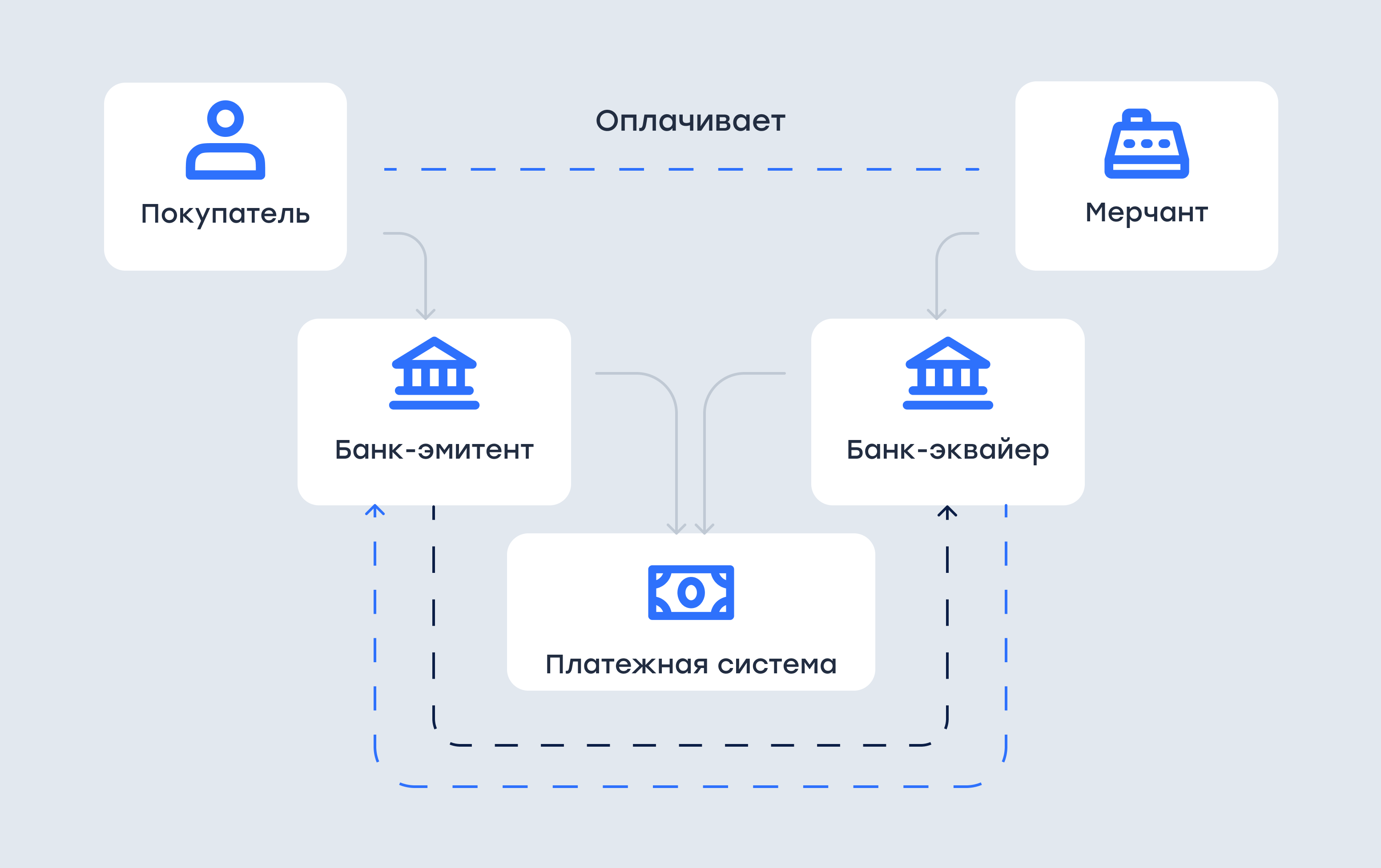 Вот как можно схематически изобразить участников процесса эквайринга и их взаимодействие: