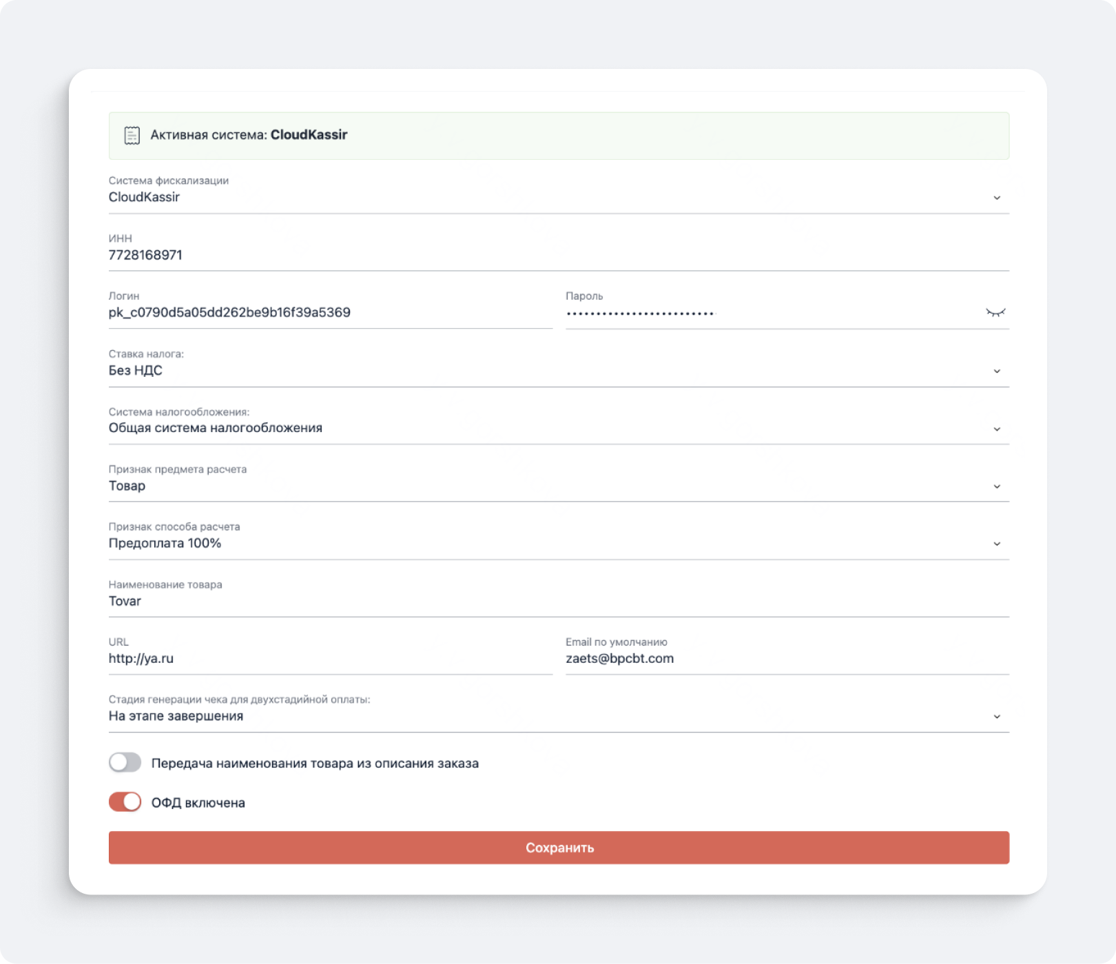 Если нужна помощь, отправьте письмо на eacq@alfabank.ru с темой: «Настройка кассы CloudKassir ИНН + контактные данные»