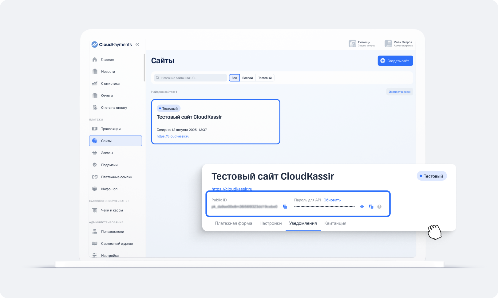 Public ID и пароль API отображаются в Личном Кабинете CloudPayments: