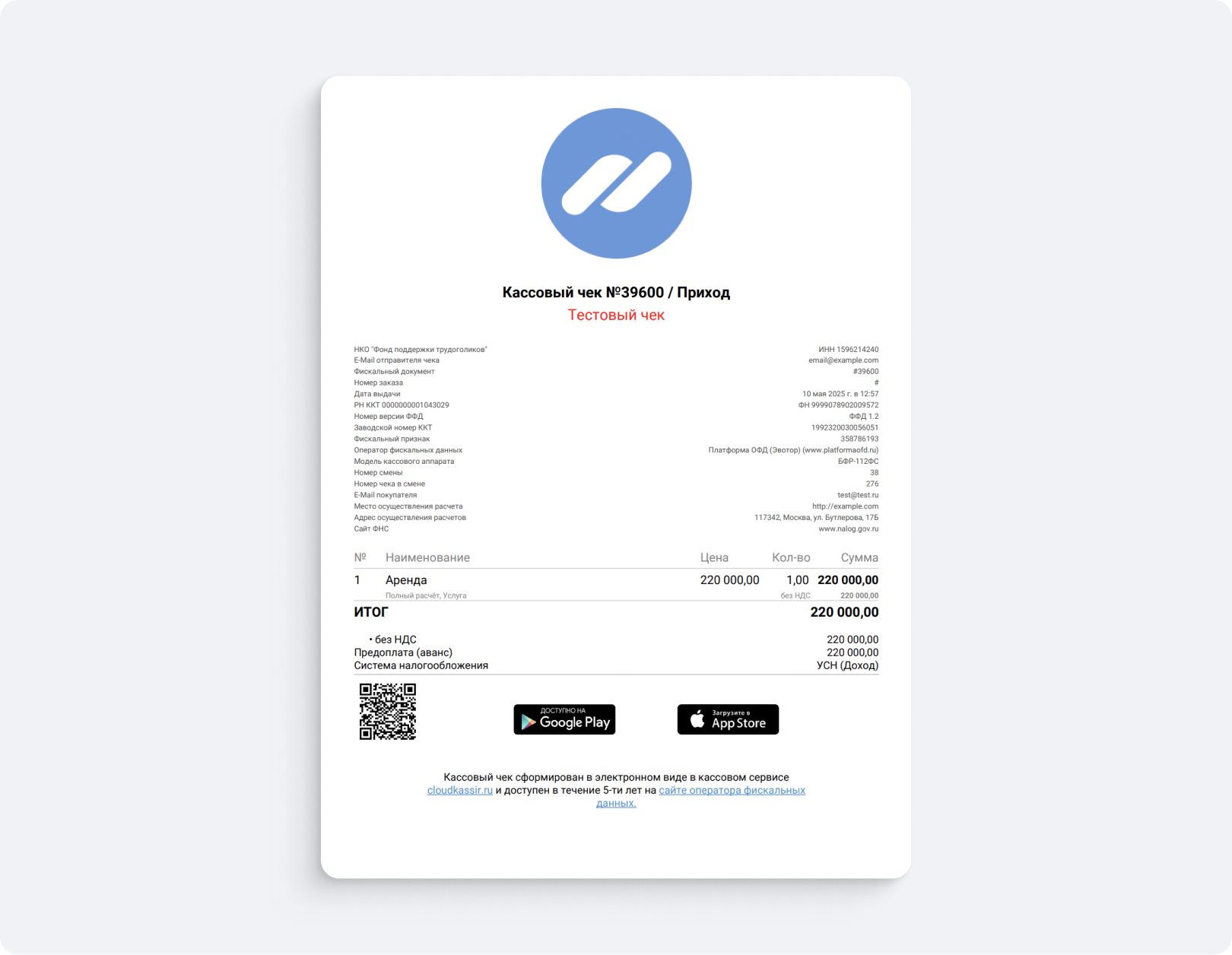 Если в чеке есть пометка «Тестовый чек», это означает, что касса находится в тестовом режиме. В тестовых чеках: