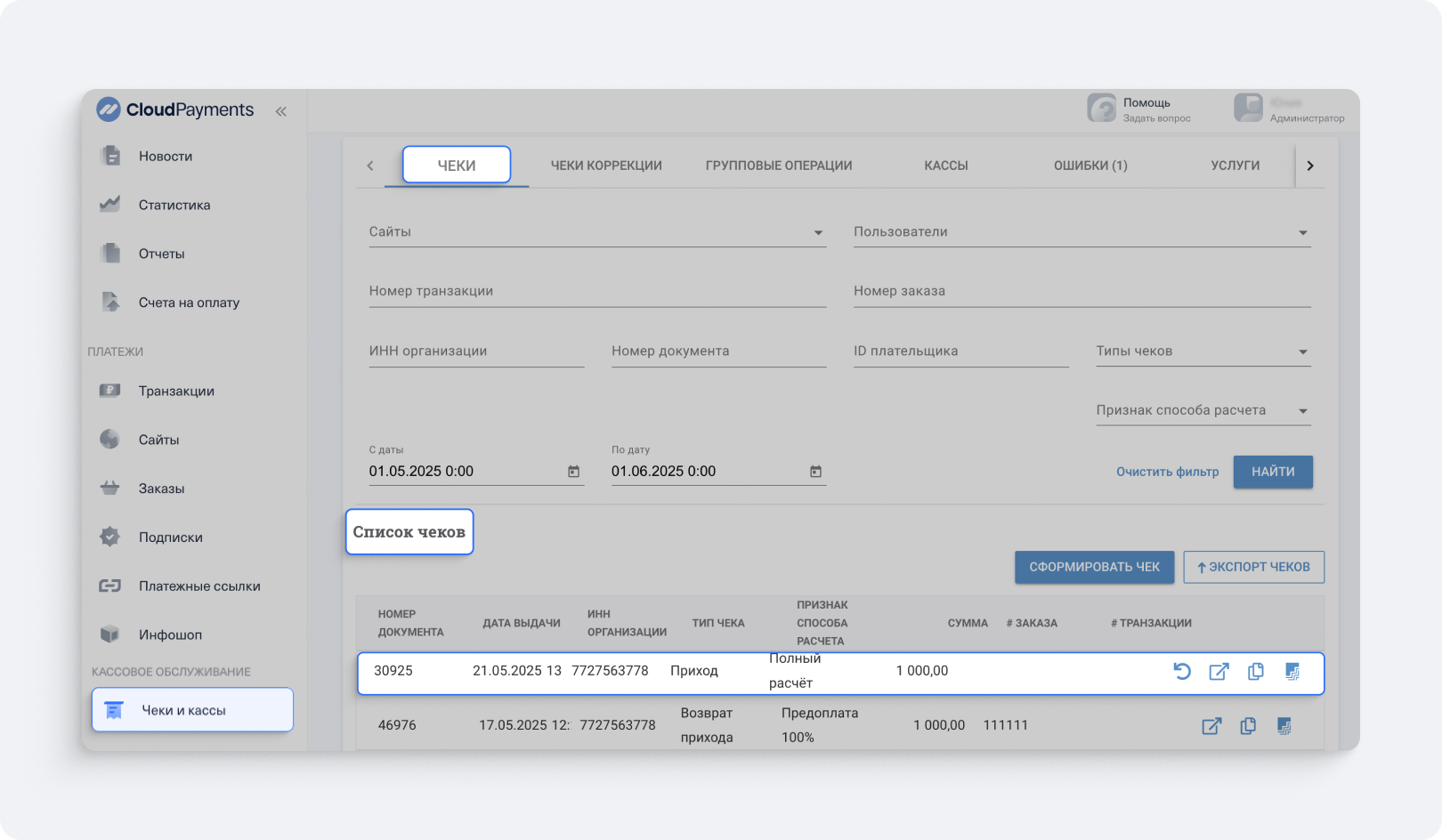 - Сформированный чек отобразится в Личном кабинете CloudPayments