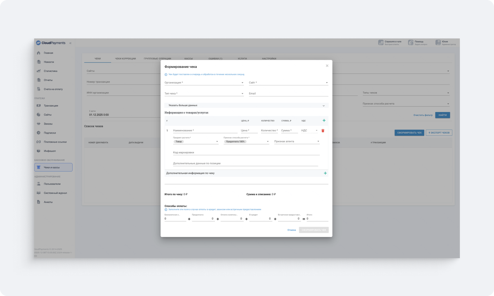 Формирование чеков в Личном кабинете CloudPayments