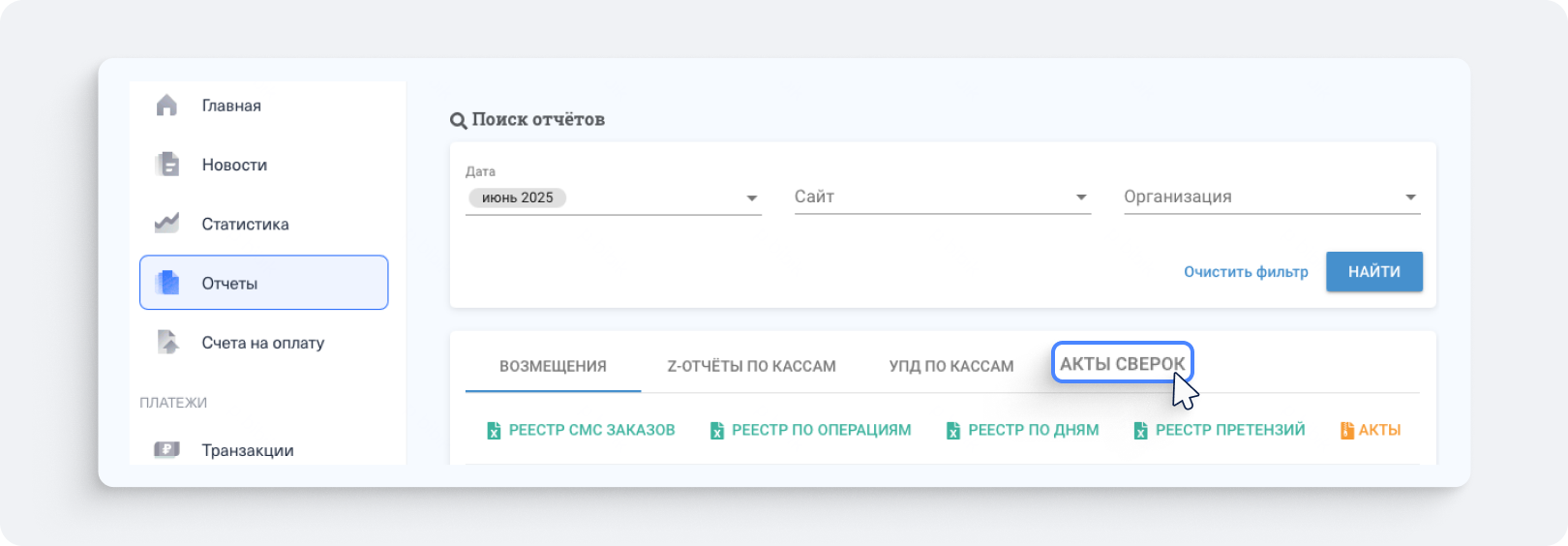 В разделе Отчеты по кнопке «Акты» вы можете скачать ежемесячные отчеты — эта кнопка появляется только тогда, когда вы указали закрытый период (прошлый месяц или более ранний). В отчетах содержится информация о транзакциях по выбранной организации: