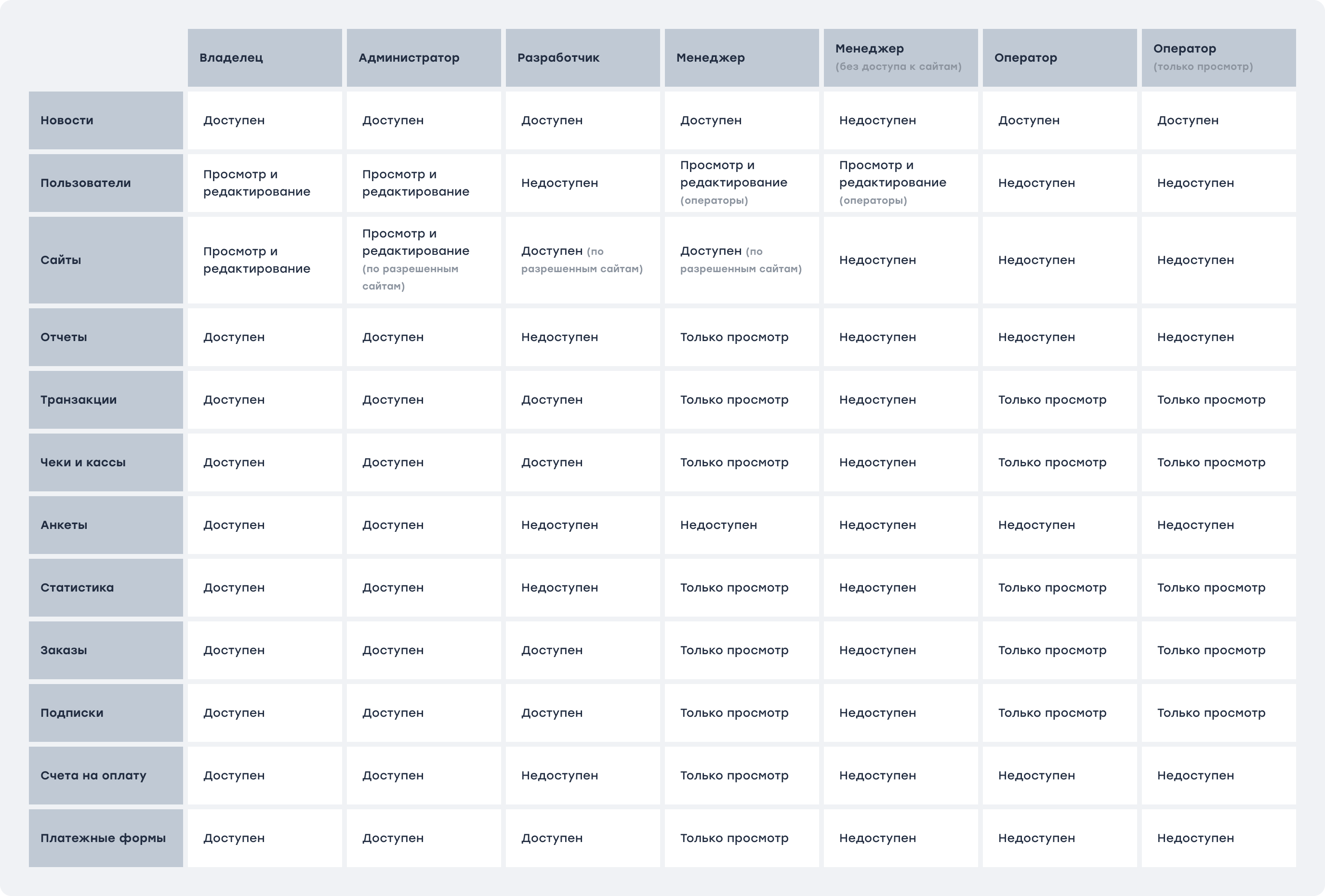 Роли помогают разграничить доступ между сотрудниками и настроить работу с кабинетом под задачи команды: бухгалтеру — отчеты и чеки, менеджеру — операции и статистику, техническому специалисту — сайты и интеграции.