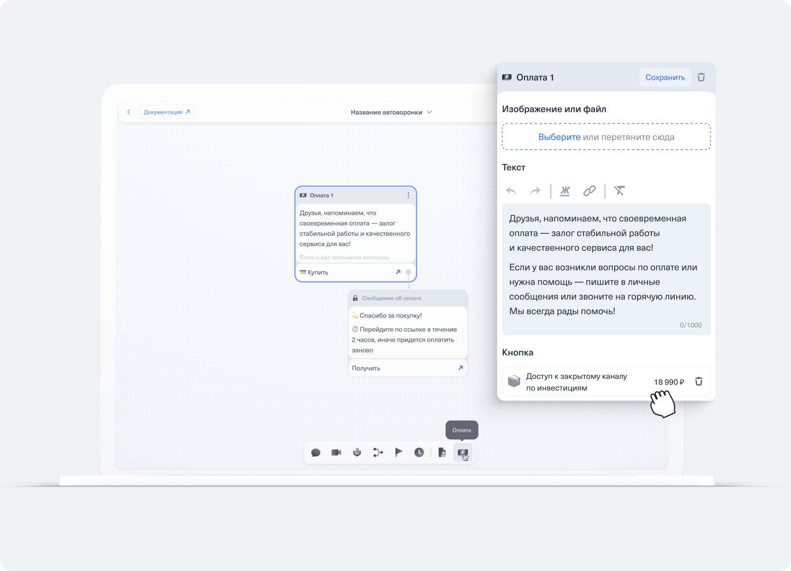 Работа в редакторе автоворонки CloudBot — настройка оплаты