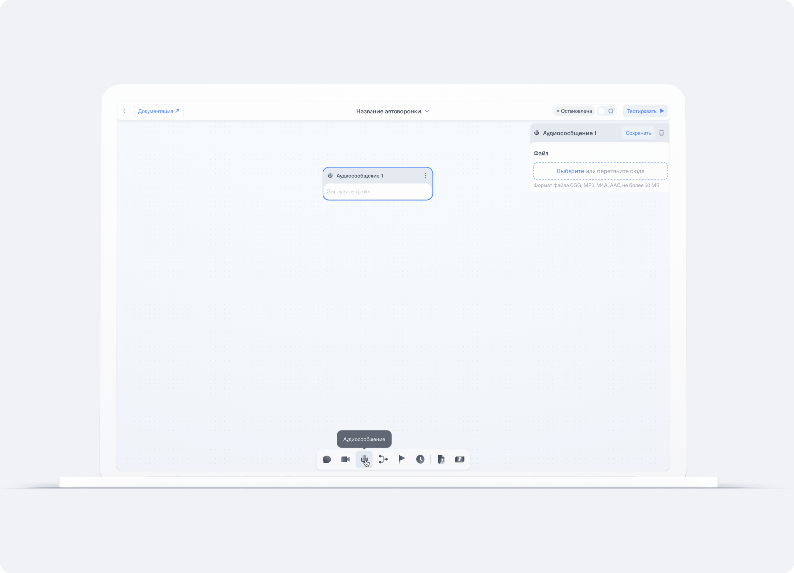 Работа в редакторе автоворонки CloudBot — настройка аудиосообщения