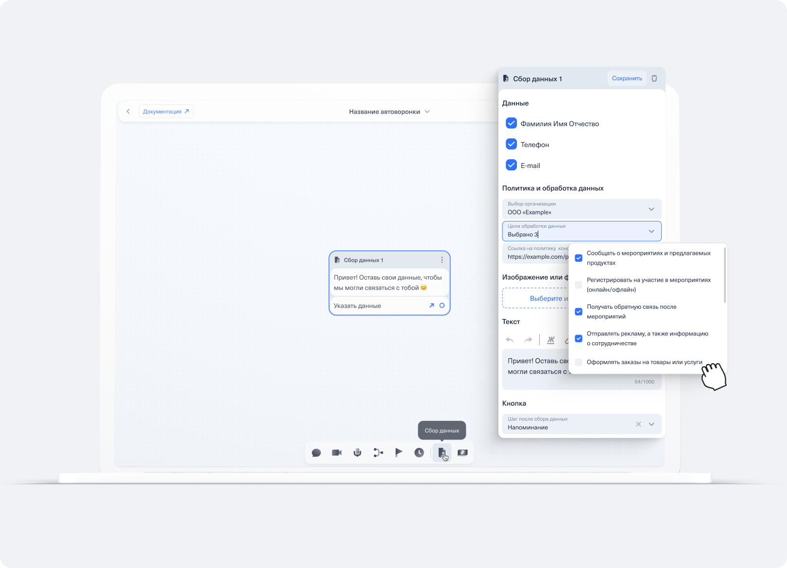 Работа в редакторе автоворонки CloudBot — настройка сбора данных