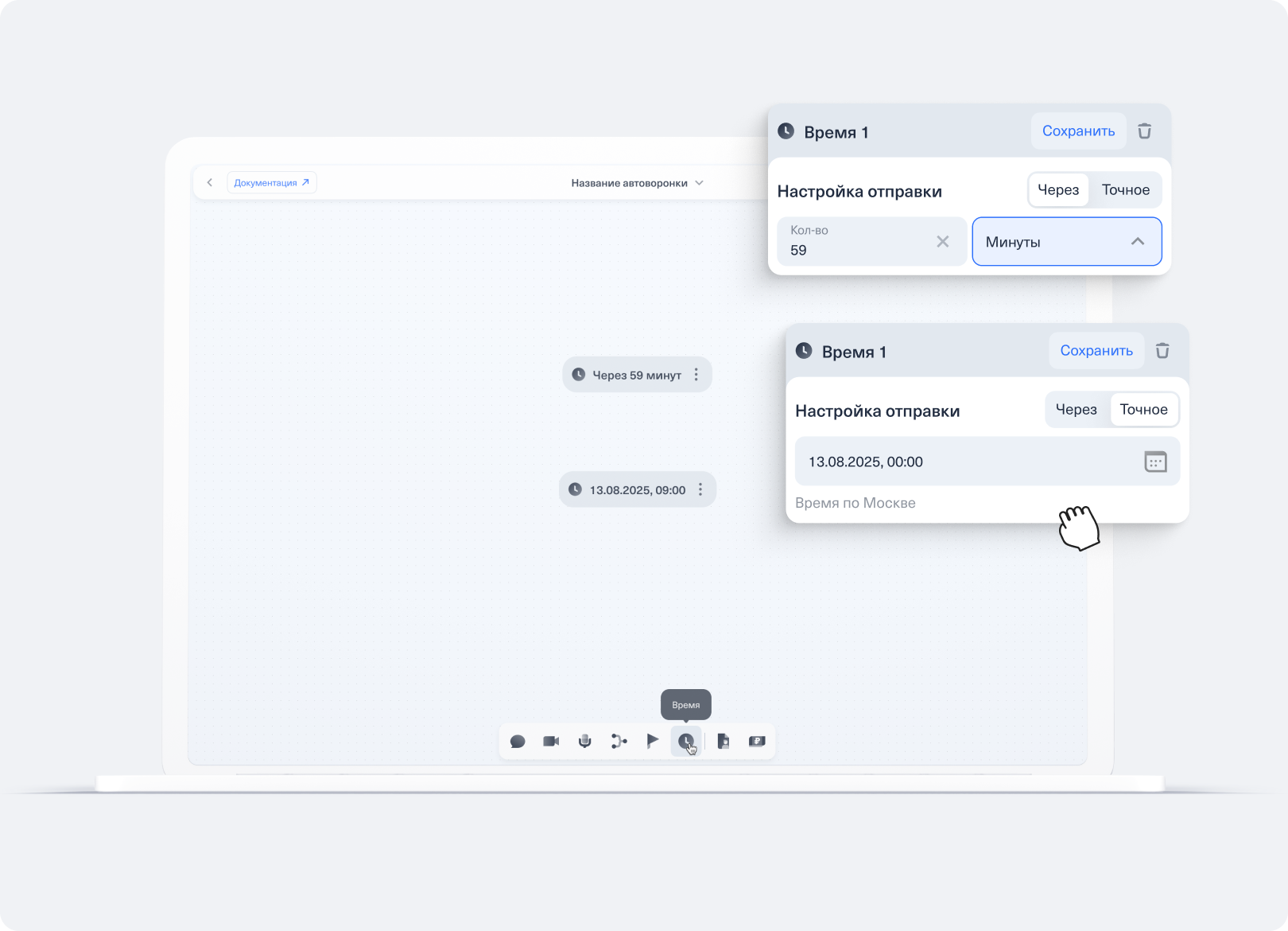 Работа в редакторе автоворонки CloudBot — настройка времени отправки