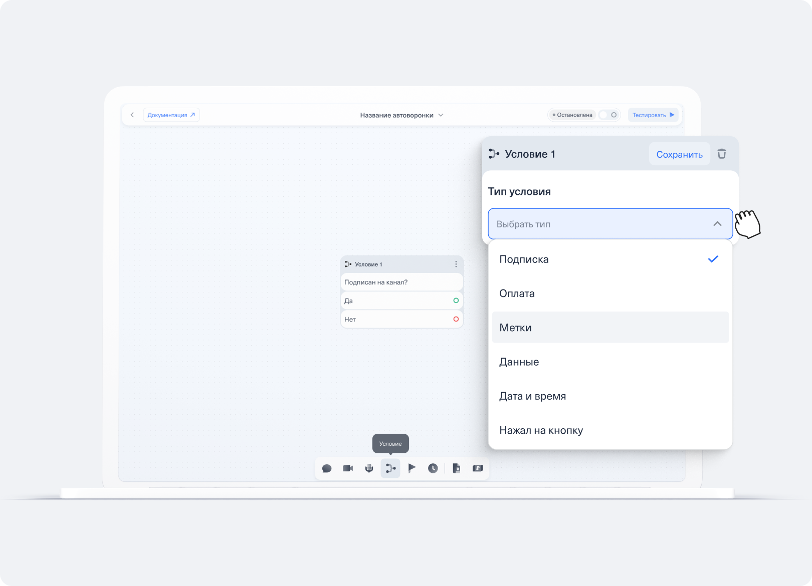 Работа в редакторе автоворонки CloudBot — настройка условий