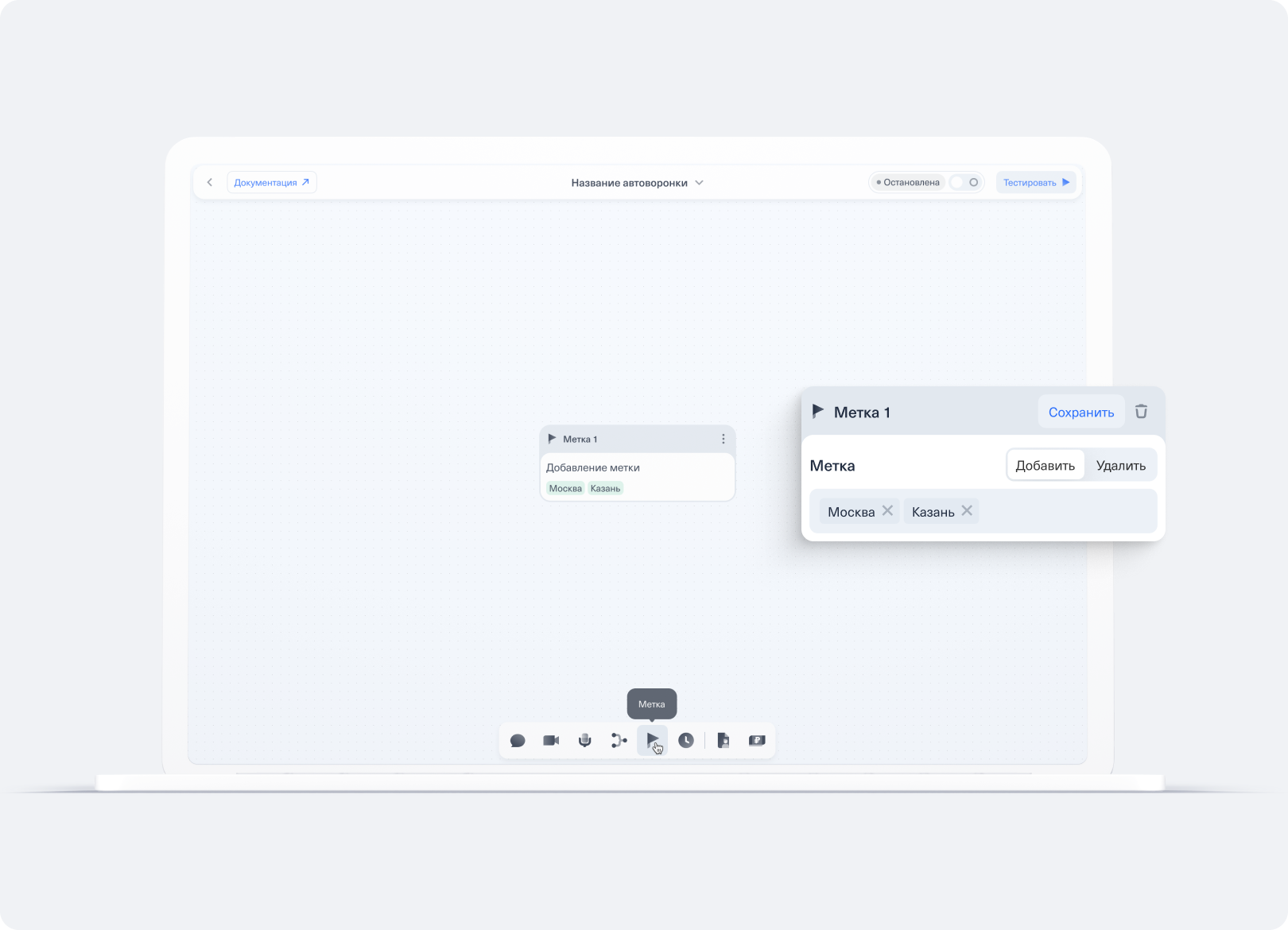 Работа в редакторе автоворонки CloudBot — настройка метки