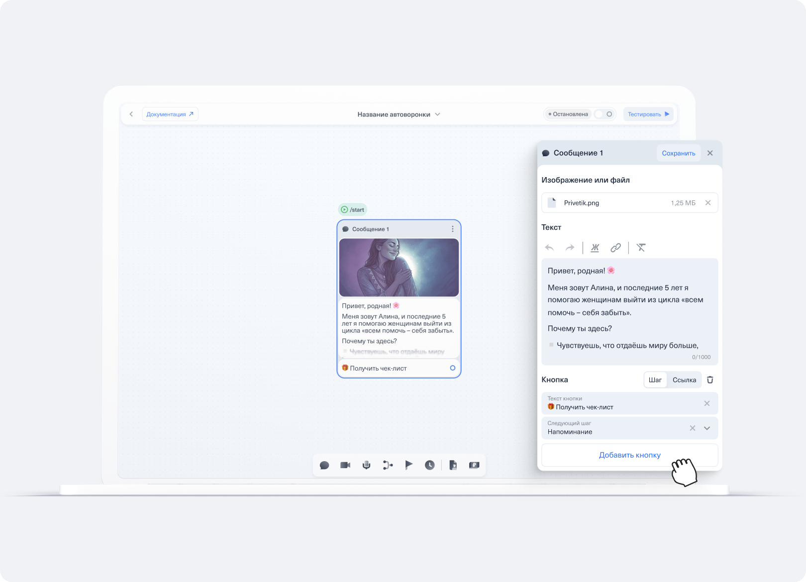 Работа в редакторе автоворонки CloudBot — настройка сообщения