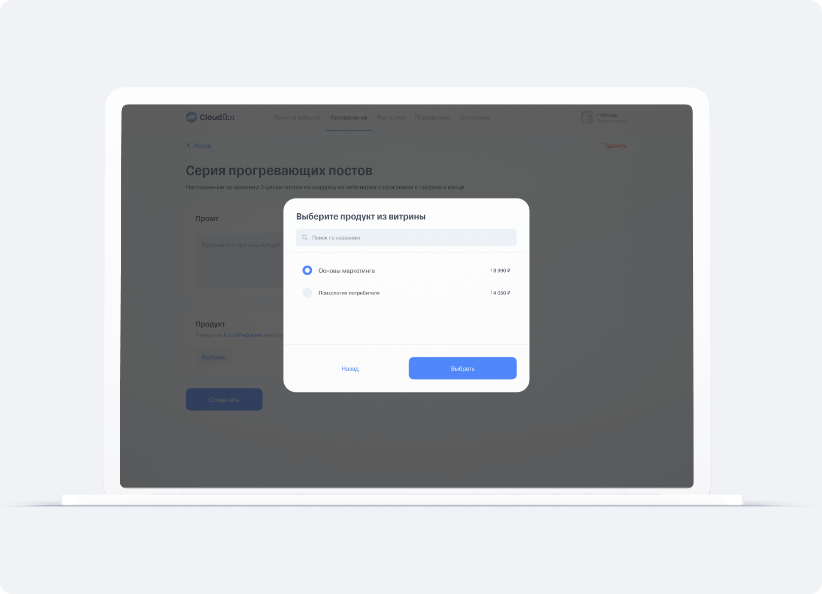 Вернитесь в редактор CloudBot и в нужном блоке выберите только что созданный продукт.