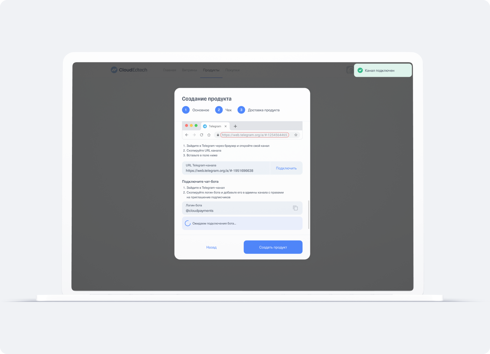 При этом можно использовать разные модели оплаты: разовый платеж или подписку. Чтобы настроить оплату, используется сервис CloudИнфошоп. В нем создается продукт и витрина, после чего продукт можно привязать к своей автоворонке.