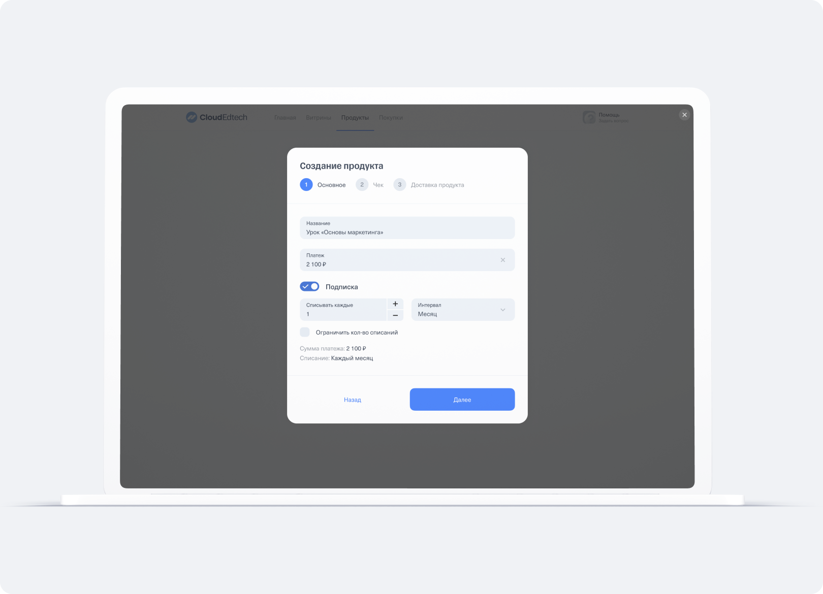 - Модель оплаты: разовый платеж или подписка (включается тумблером)