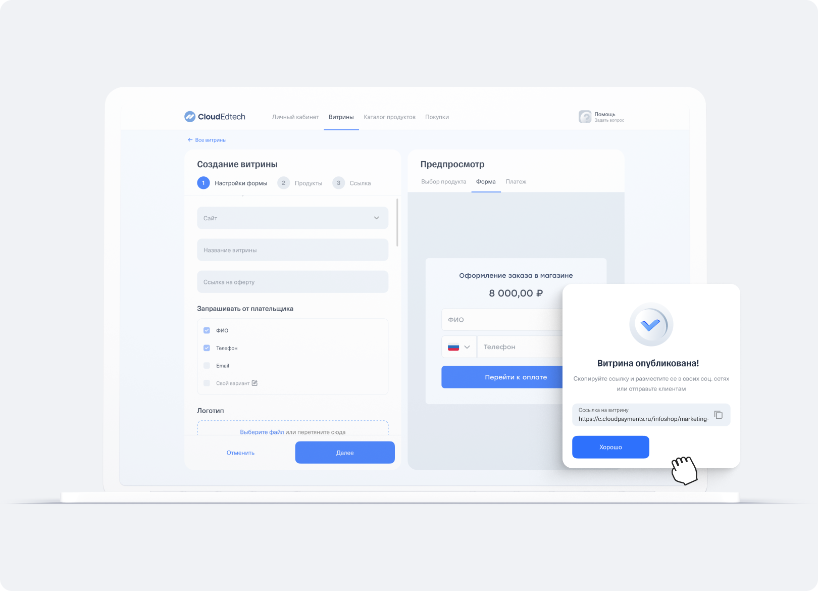 - Нажмите «Создать витрину» и следуйте шагам на экране