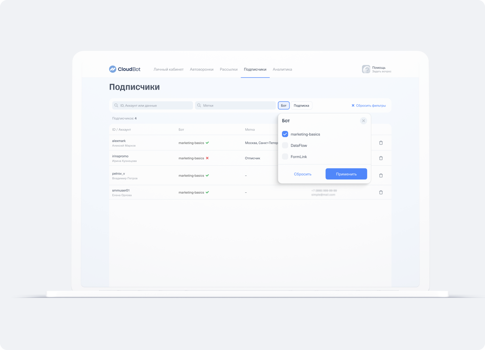 В CloudBot вы можете просматривать, кто взаимодействовал с вашим ботом, кто подписался на бота и как проходит автоворонку. Все данные хранятся в разделе Подписчики.